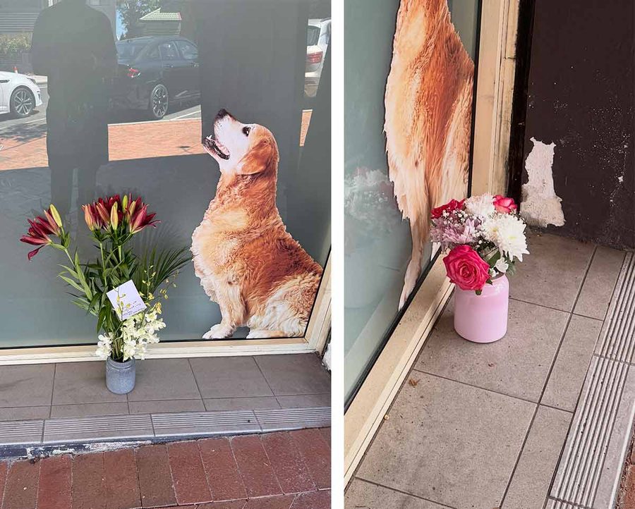 And in other news – there have been flowers for Dozer left outside RTM (our food bank), beside the life-size sticker of him on the window. My team didn’t tell me about this until I came back to work this week, and of course this triggered a flood of tears as I was so touched.