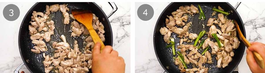 Garlic and green onion – When the chicken is mostly cooked, add the garlic and the white part of the green onion. These are aromatics that will flavour the oil and chicken.