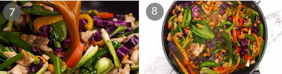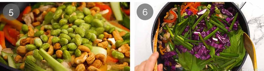 - Cook chicken until mostly cooked, add garlic and white part of green onion towards end. Add first: capsicum, bok choy stems, cashews and edamame (1 min). Then bok choy leaves, cabbage and green part of green onion (30 seconds). Add sauce, thicken, then finish with sesame oil. Serve!