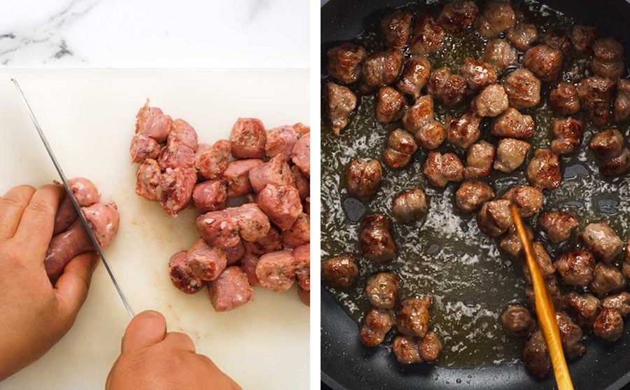 Cut the sausages into even size pieces so they are roughly as wide as they are long, so they will cook into balls rather than cylinders! So if your sausages are thin, you’ll have more smaller meatballs. Whereas if you have fat sausages, you’ll have larger but less meatballs. Both are food situations!