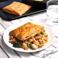 - To serve, divide the chicken filling between 4 plates and top with a piece of puff pastry.