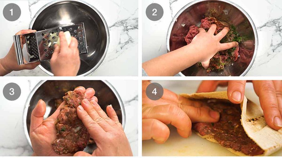 Grate the onion using a standard box grater. Why grate rather than chop? Because grated is finer than chopped so you don’t need to cook the onion separately before mixing into the meat. It will cook enough with the meat. Plus, the onion juices make the meat mixture even tastier!