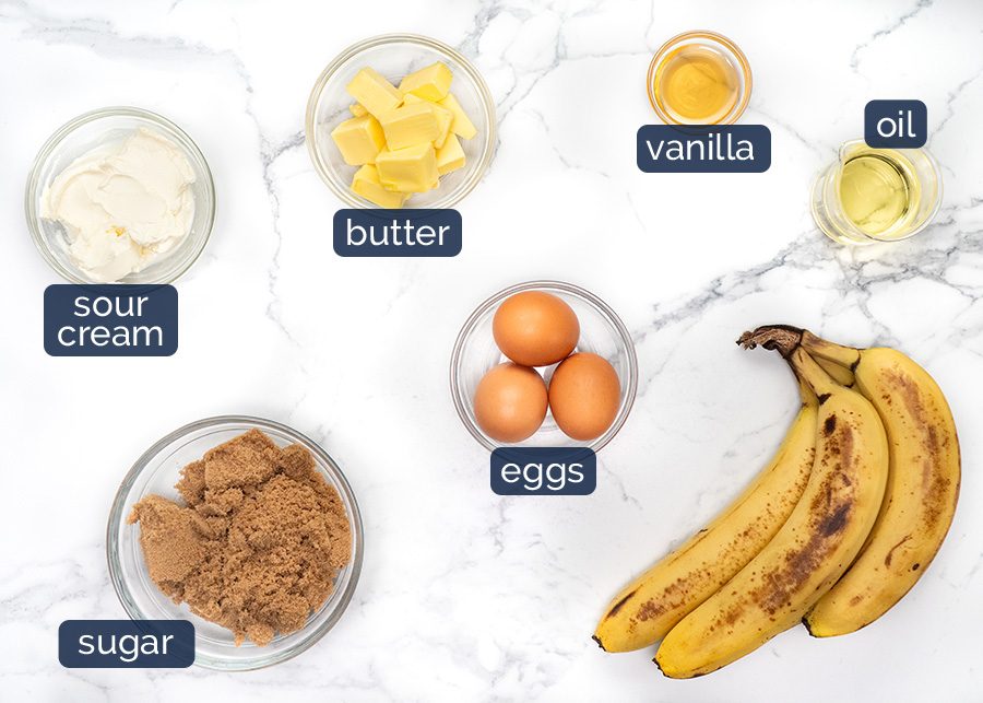 - Sour cream – As with the oil, the fat in sour cream helps create a soft crumb and prevent the bread from drying out. More importantly, its mild acidity is the key element needed for the baking soda to react and create the beautiful banana bread rise. Yoghurt is a great substitute. Avoid milk or buttermilk, they are thinner and can change the batter consistency, leading to a looser structure.