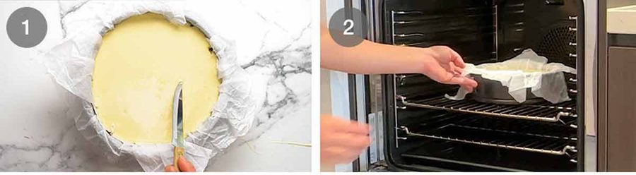 Don’t be tempted to try to make the cheesecake sides smooth by lining the cake pan the traditional way with flat strips of paper! The crumpled paper actually keeps the sides of the cheesecake from overcooking as it’s not fully pressed against the pan walls. Flat paper = thicker band of drier cheesecake. Tried and tested!