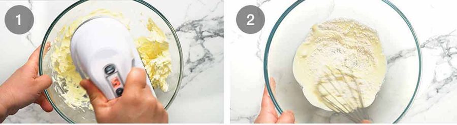 Use a handheld electric beater or stand mixer with the paddle attachment. I personally prefer hand-held beater because the beating times are pretty short, and you can move it around which means less scraping down sides.
