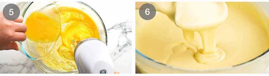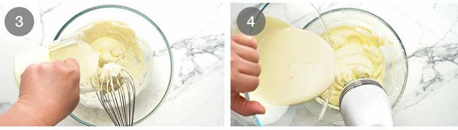 - Slowly pour the cream into the cream cheese bowl with the beater going on low. Beat just until combined. Then slowly pour the eggs in while the beater is still on low speed. As soon as the eggs are incorporated, stop beating to minimise getting bubbles in the batter (Note 7).