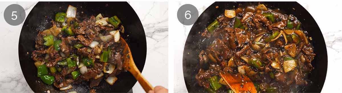 - Marinade beef 1 hour, soak beans, mix sauce. Shallow fry beef 30 seconds, remove. Discard all but 3 tbsp oil. Add and cook in this order: black beans 20 seconds, garlic 10 seconds, onion + capsicum 1 minute, beef 1 minute, cooking wine 30 seconds, sauce 1 minute or until thickened. Serve!
