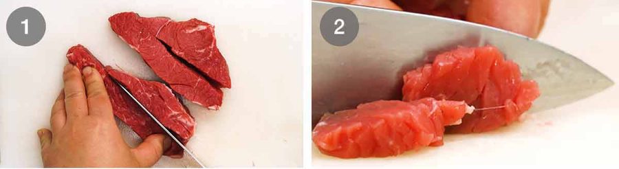 - 300g/ 10 oz rump beef steak (US: top sirloin) (Note 1 for more cuts) sliced into small thin pieces (3-5mm / 0.2" thick, ~1.5cm / 0.6" squares)