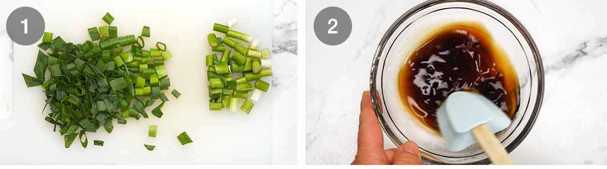- 4 green onion stems , cut into 1.25 cm / 1/2″ lengths, white part separated from green part