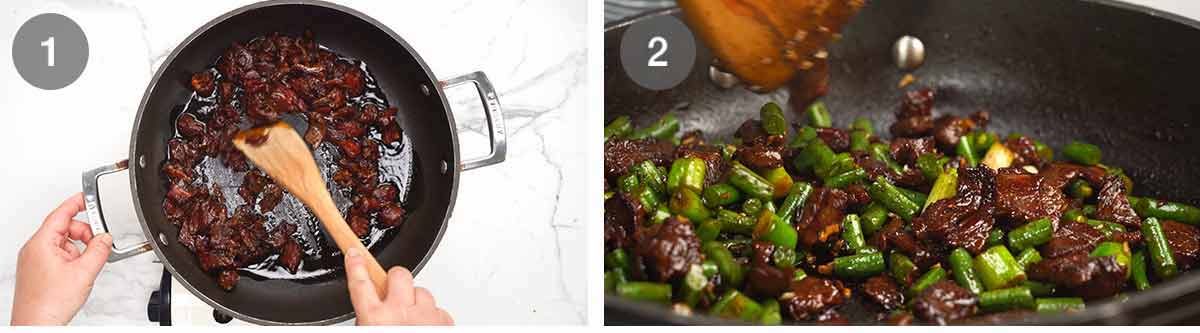 - Sizzle beef – Heat 2 tablespoons of oil in a large non-stick pan over high heat (mine is 30cm/12", see Note 8 for why no wok). Add the beef and cook for 2 minutes until the surface is sealed. Add the garlic, white part of the green onion and beans. Cook for another 1 minute until the beef is caramelised, stirring constantly so it doesn't catch and burn.