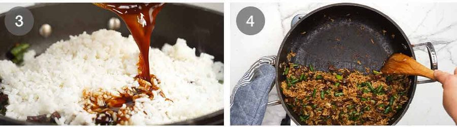 - Marinate beef 1 hour. Cook beef in 2 tbsp oil on high in a large pan until lightly seared, add white part of green onion and beans, cook until beef is caramelised, adding garlic towards the end. Add rice and sauce, toss well. Scramble egg on side of pan, toss through green part of green onion. Eat!