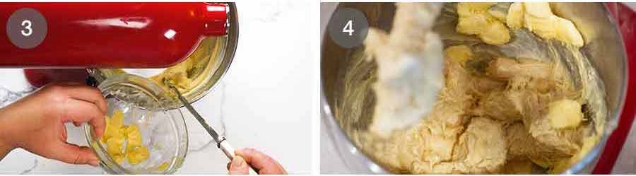 Slowly add butter: With the stand mixer still on Speed 2, drop butter cubes in gradually. Do this over about 90 seconds to 2 minutes, giving the dough a chance to mix most of the butter in. Don’t dump all the butter in one go as it will take much longer for the butter to incorporate;