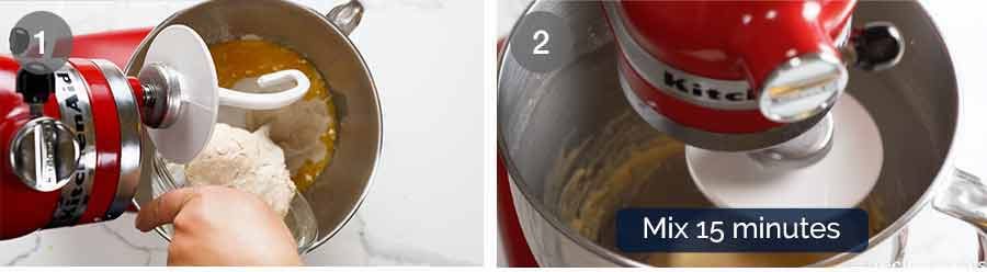Mixing – Part 1 (15 minutes): After the ingredients are combined, then mix on Speed 1 for 5 minutes then on Speed 2 for 10 minutes. Yes really, for 15 minutes!
