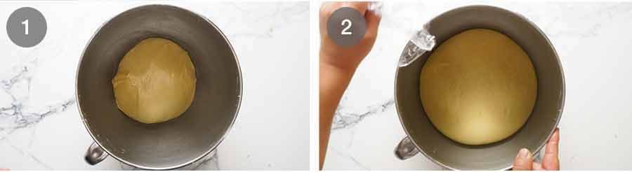 - Rise #1 (2 hrs): Shape the dough into a ball, put it back into the stand mixer bowl. Cover with cling wrap and put it in a warm place for 2 hours until it has doubled in size.