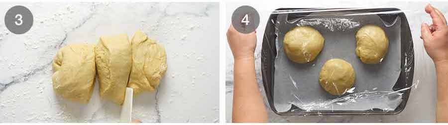 - Cut into 3: Punch the dough dough to release all the air. Scrape out onto a lightly floured work surface. Fold the outside of the dough in 6 times. Shape into a log then cut into 3 equal portions and shape into a ball (~225g/7.9oz per piece).