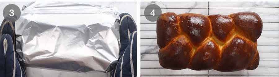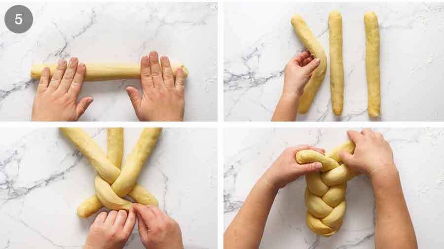 - Braid: Remove dough from fridge. Place on a lightly floured work surface and roll each piece into a 35cm/14" logs. Braid the logs, and tuck the ends under to make them tidy.
