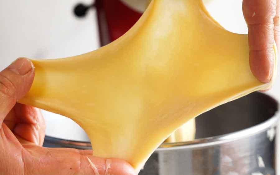 The “window pane test”: The “window pane” test will tell you if your dough is also sufficiently elastic which means it has been kneaded enough. Take a walnut size piece of dough and stretch out into a thin film using your fingers. If you can see light through it and do this without the dough breaking, then it has been kneaded enough. If not, keep kneading!