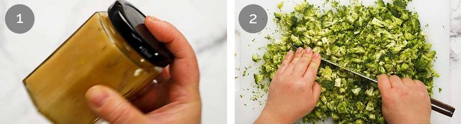 Marinate broccoli – Toss the broccoli with salt, red wine vinegar and 2 tablespoons of the Dressing. I add a little extra vinegar because it’s stronger at softening raw broccoli than the oil-based dressing alone.