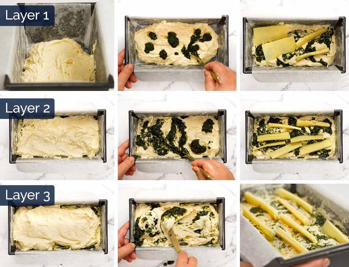- Swirls and cheese Layer 1 – Pour 1/3 of the batter into the bread tin. Dollop 1/3 of the herbs across the top then use a knife to "swirl" it into the batter up and down, and also turning the batter over (refer photo below). Use 1/3 of the cheese slices and push them randomly into the batter. Push some all the way in and leave some poking out of the batter.