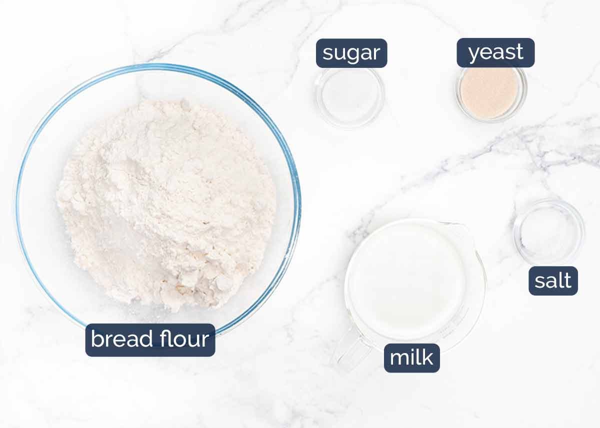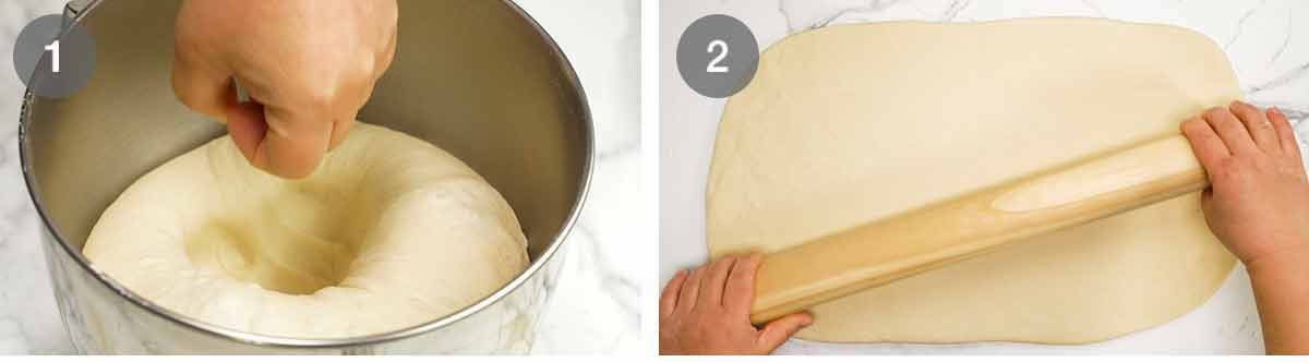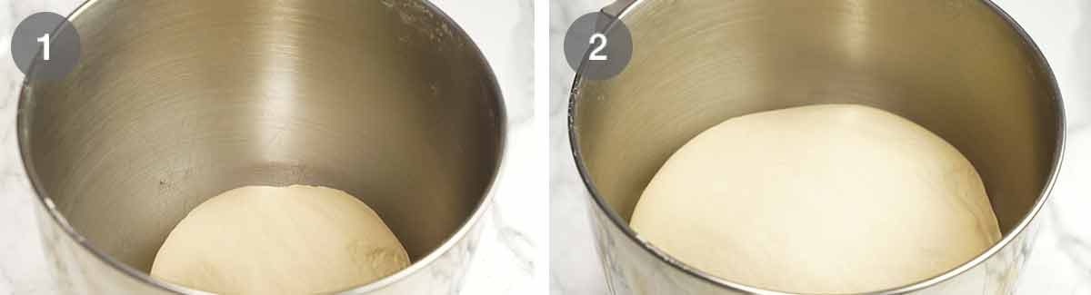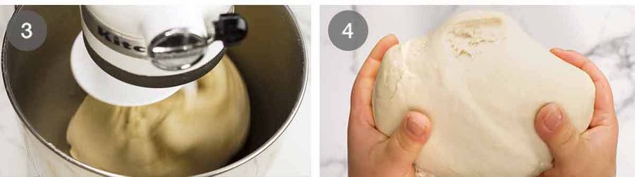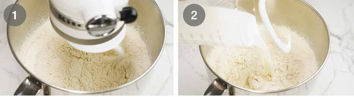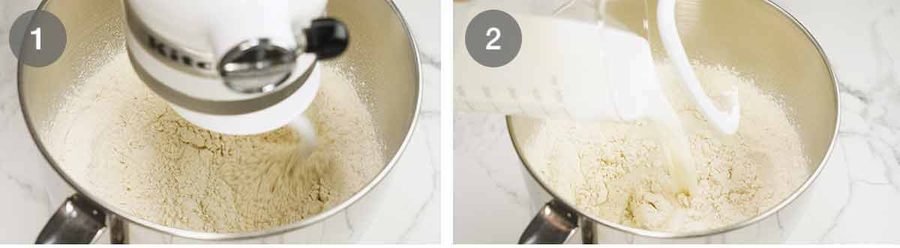 - Make dough – Put the flour, yeast, sugar and salt in the bowl of a stand mixer fitted with a dough hook. Briefly mix to combine. Add the milk then mix on low until you no longer see flour. Then beat, starting on low then increasing to medium partway through, for 5 minutes until the dough is smooth (see video for before/after visuals). (Note 8)
