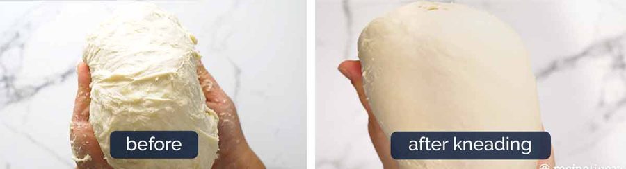 How to tell the dough is ready – Hold the dough in a ball in your hands. When you stretch the surface of the dough, it won’t break. If you do this before kneading, the surface of the ball of dough breaks.