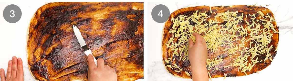 - Spread the dough with butter then with Vegemite. Sprinkle the whole area evenly with 3 cups (300g) of the cheese.