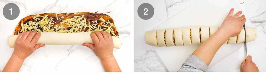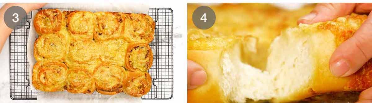 Bake for 25 minutes at 180°C/350°F (160°C fan-forced). Then rotate the pan and bake for a further 10 minutes at 200°C/375°F (180°C fan-forced) or until the cheese on the surface of the scrolls around the edge of the pan are light golden.