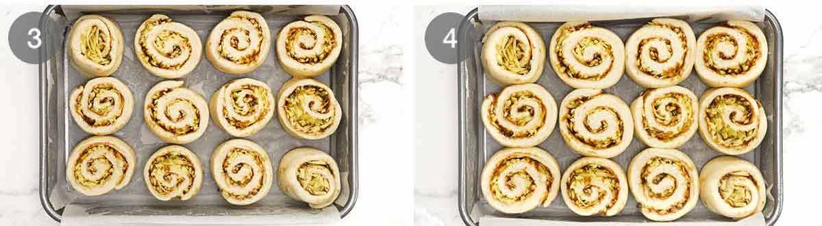 - Rise #2 – Place the scrolls into the pan, evenly spaced apart. Spray a piece of cling wrap lightly with oil then cover the pan. Let the scrolls rise in a warm place for 30 minutes or until they expand/rise by about 30-50%.