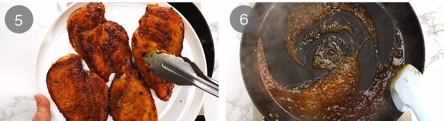Remove the chicken onto a plate to rest for 3 minutes. Don’t skip this, it makes the chicken juicier to eat because as it rests, the meat juices to redistribute into meat fibres so it ends up in your mouth. If you skip resting, when you cut the chicken the juices run out onto the plate. Use this time to make the pan sauce (1 minute!), put the chicken onto serving plates etc.