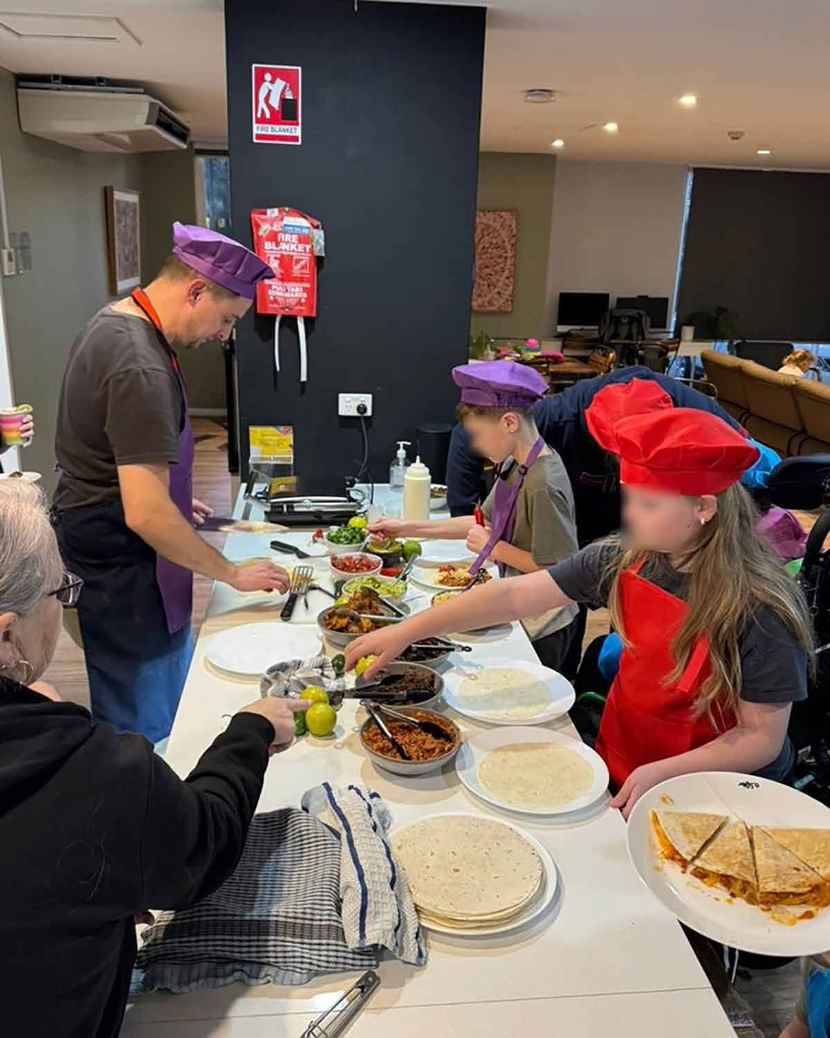 That’s JB on the left in the photo below, at the quesadilla station Forget chef whites! Bring on the colour!