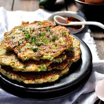 We love these pancakes for dinner – or anytime! But especially during zucchini season. I make them with whole wheat pastry flour. After I let the batter sit, I usually end up adding a bit of extra water. I don’t fry them in the amount of oil called for here, I just heat my pan to pancake temperature, then spray the pan with a bit of oil. Any Asian dipping sauce works here.