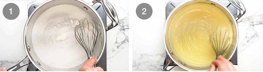 - Whisk dry, then wet – Place cornflour, sugar and salt in a large saucepan. Whisk to combine. Add milk, cream and yolks. Whisk to combine.