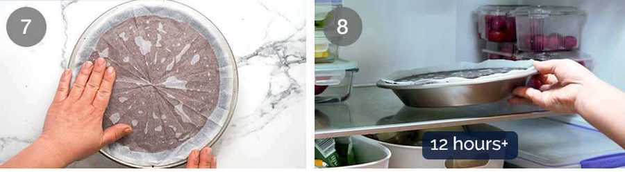 - Pour hot filling into pie crust, filling it right to the top, smooth surface. Gently place round baking paper on surface. (Surplus custard? Note 7)