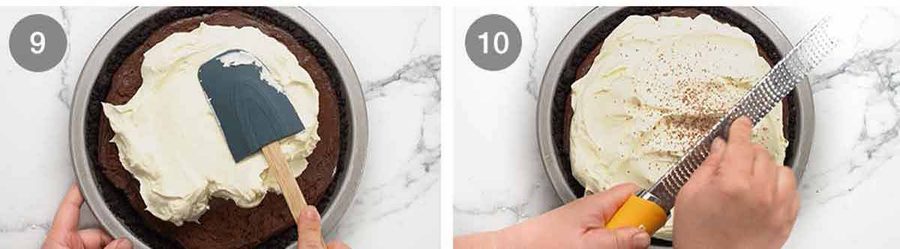- Topping – Carefully peel back paper. Pile on the whipped cream, then grate chocolate across the surface.