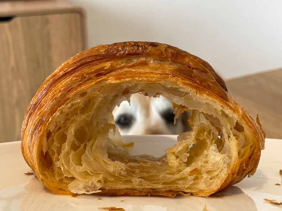 No chocolate for you Dozer! How about some croissant instead? (Like I have a choice! 😂)