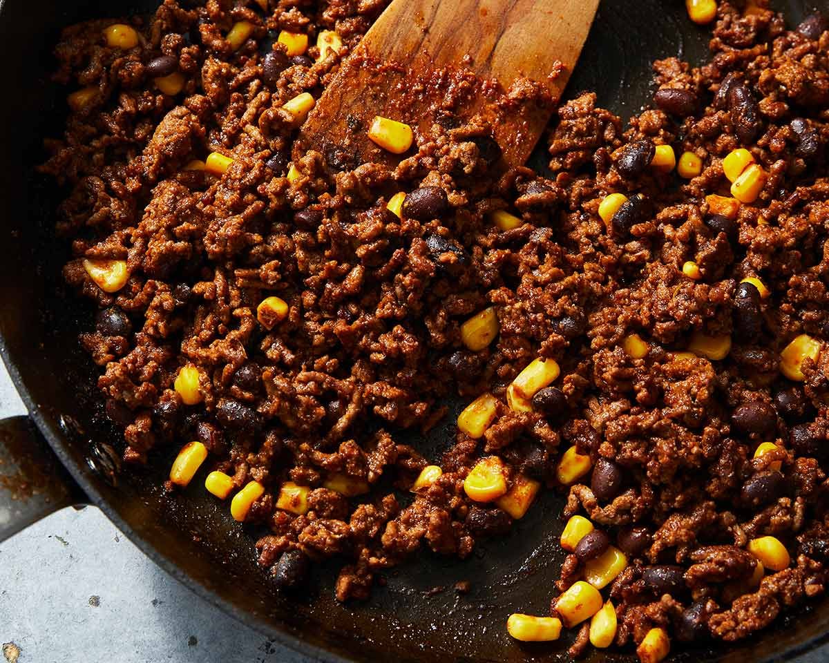 - Filling – Heat the oil in a non stick pan over high heat. Add the beef and cook, breaking it up as you go, until the red colour is mostly gone. Add the Taco Seasoning and cook for 1 minute. Add the tomato paste and cook for 30 seconds. Stir in the beans and corn, then add the water and stir. The filling should be juicy (not dry) but not watery (compromises crispiness!). Remove into a bowl and cool for at least 15 minutes.