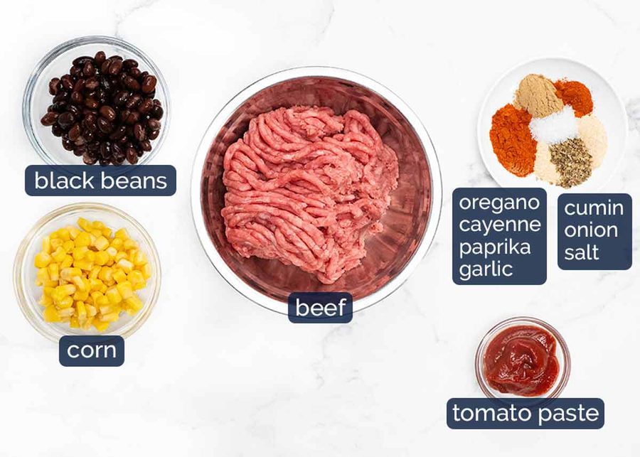 Corn and beans – This is to add some bulk and different texture into the filling, rather than just using meat. I use canned, though you can use frozen corn as well. (Use leftovers in a salad or freeze flattered in ziplock bags so you can snap off a bit more the next time you make this!).