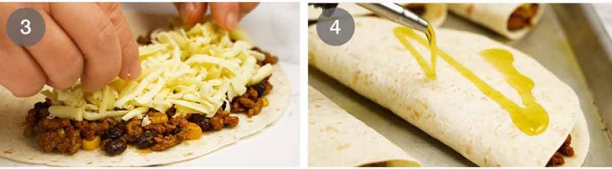 Beef filling – Cook the beef first, breaking it up as you. Then when the red (raw) colour is just about gone, add the Taco Seasoning and cook it for 1 minute which will bring out the flavour. Add the tomato paste and stir for another 1 minute to cook off the sour raw flavour. Stir in the corn, beans and water. The water will “juice up” the filling a bit without making it watery (which will compromise crispiness).