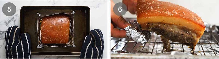 - Level pork: Remove pork from foil, discard fat and foil. Place pork on a rack set over a tray. Use scrunched up balls of foil stuffed under pork to prop it up so the skin surface is as level and horizontal as possible (see photos in post).