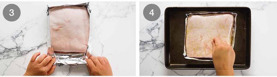 - Foil boat: Place 2 pieces of foil on a work surface. Put the belly in middle of foil, skin side up. Fold the sides in to enclose the belly, forming an open box, pinching corners to seal tightly and make it as snug as possible. Place meat on a tray.