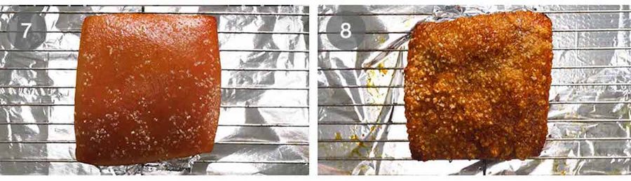 Crackle it! Then blast the pork belly in a hot 240°C/465°F (all oven types) for 30 minutes, rotating as needed (if your oven heat is patchy) and using scraps of foil if needed to protect parts that crackle faster.