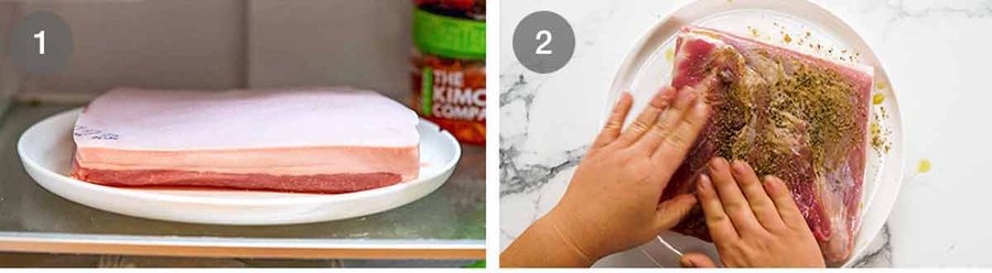- Dry skin overnight: Place pork belly on a plate. Pat skin dry with paper towels. Leave uncovered in fridge overnight to dry out the skin. (If you don't have time, pat the skin dry as best you can).