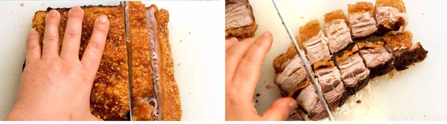 Using the tried and true (easy!) tips in my Crispy Pork Belly recipe, this pork belly has terrifically crispy crackling that is crispy from edge to edge – no rubbery spots – with a tender fall-apart-flesh. It’s initially slow roasted to make the meat tender and dry out the skin, then blasted at a high heat to make the skin crispy.