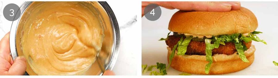 - Blitz half prawns and garlic, mix with rest of pattie ingredients. Roll into balls, dredge in flour, egg, then flatten into patty in panko, flip to coat. Fry 4 minutes until golden, assemble burgers.