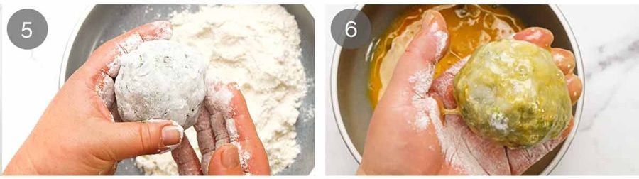 Flour – Working one ball at a time, coat in flour and shake off excess. Note: The mixture is quite soft so I find it’s easier for handling to do the dredging steps in ball form then press into pattiy shapes at the end.