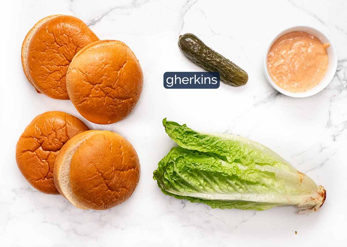 Soft buns – My top-shelf choice is brioche buns, for the pillowy softness, slightly sweet and buttery flavour. Else, any soft roll or bun will work, or you can cut rounds out of sandwich bread (I’ve seen this at restaurants, looks terrific and quite gourmet, with neat uniform rounds).