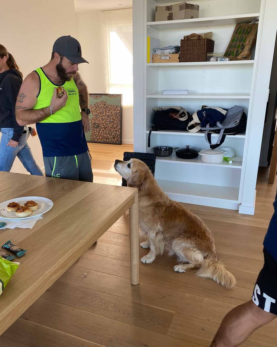 Dozer on move day. He was delighted to have so many new targets for treats – and he was rather successful, actually!