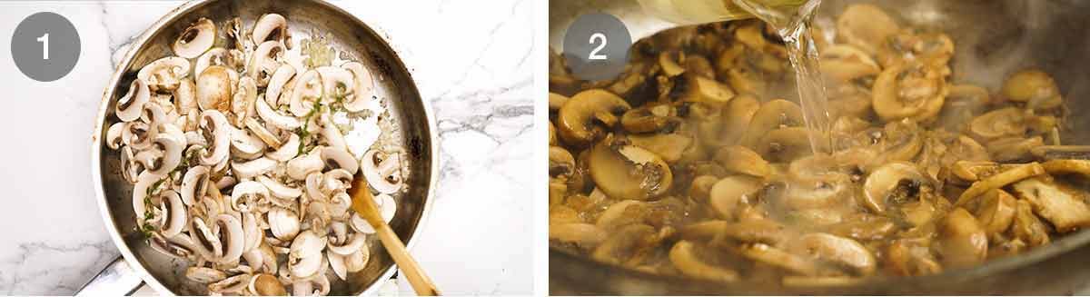 - Cook mushrooms – Melt the butter in a large pan over high heat. Add the onion, garlic and thyme sprigs. Cook for 1 minute. Add mushrooms, salt and pepper. Cook for 5 minutes until the mushrooms is softened.