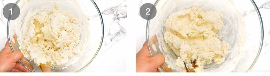 - Mix – Put all the gnocchi ingredients in a bowl except the flour. Use a rubber spatula or wooden spoon to mix until combined (smear up the wall if needed, to help cream the ricotta).