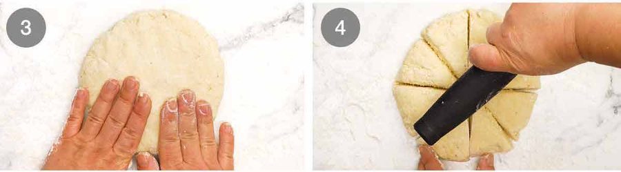 - Form disc – Sprinkle a work surface with flour then scrape the dough out onto it. Sprinkle the top lightly with flour then use your hands to give the dough a light knead to bring it into a ball then pat it into a disc about 2.5cm/1" thick. Cut it into 8 wedges, using a knife or dough scraper dusted with flour as needed between each cut